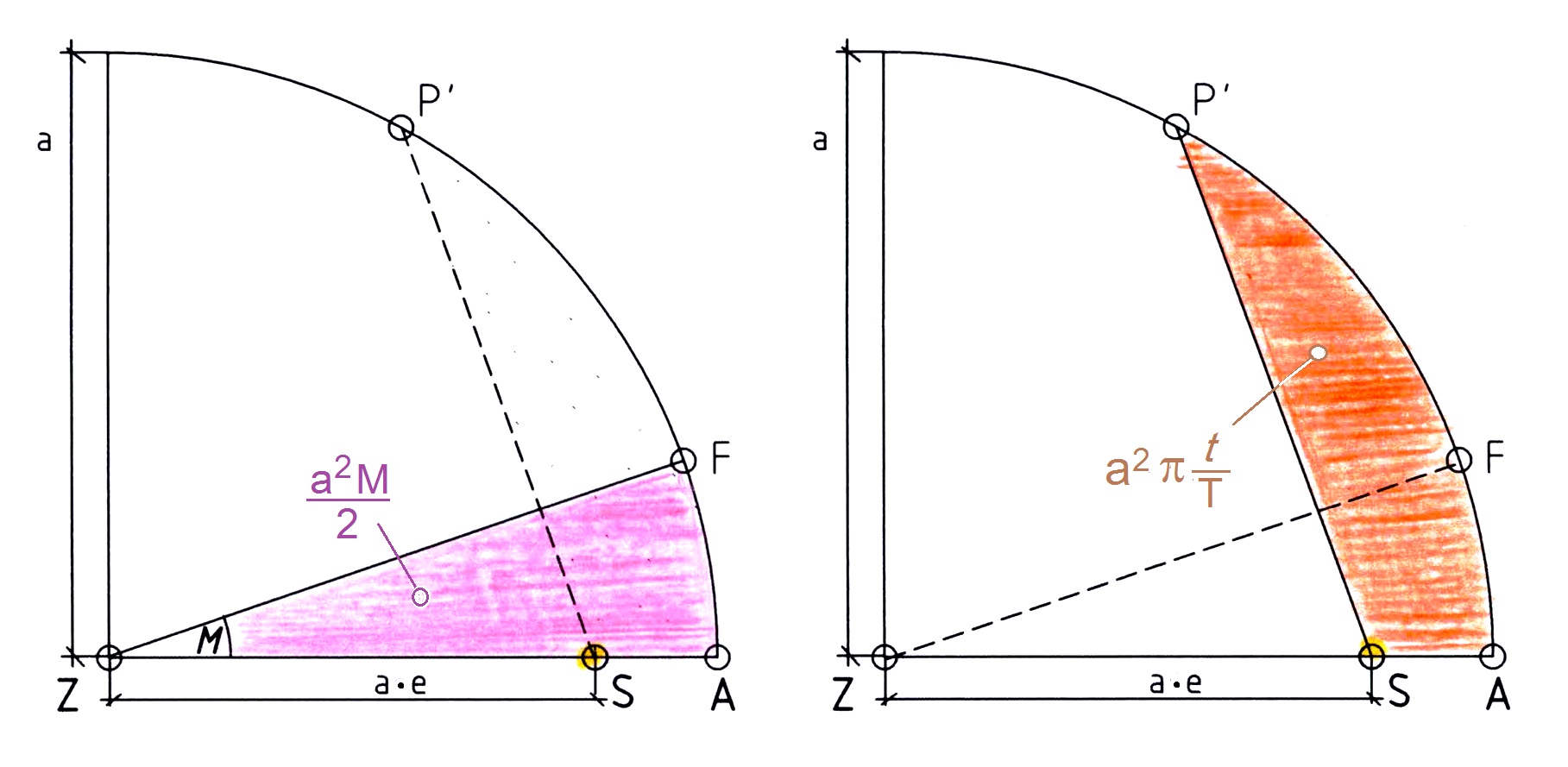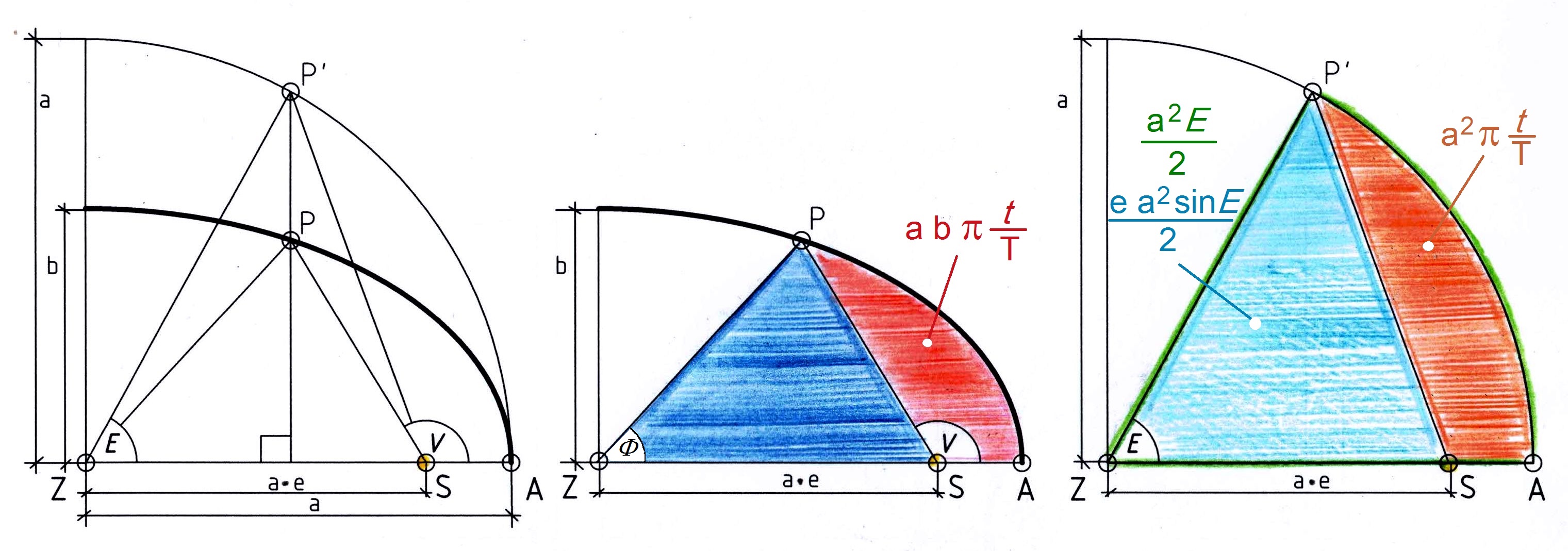 Der Fahrstrahl von der Sonne S zum Planet hat zwischen seiner Lage im Perihel A (Beginn der Zeitzählung: t=0) und seiner Lage P im Zeitpunkt t die mit dem Winkel V gekennzeichete Teil-Fläche der Ellipse überstrichen (Abb.2, links und Mitte). Die Größe der Fahrstrahl-Fläche ist leicht berechenbar, der Winkel V daraus aber nicht direkt bestimmbar. Kepler fand heraus, das Letzteres auf dem Umweg über die berechenbare Lage des zu P auf dem Umkreis affinen Punktes P' möglich ist.