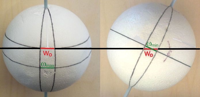Std., Min. und Sec. sind die Formelzeichen für Zeiteinheiten auf dem Mars, die um den Faktor 1,026 länger als die Der Sol ist in Perihelnähe (P) ca. 24 Sec. länger als im Mittel und in Nähe des Aphel (A) ca. 24 Sec. kürzer. Seine ganzjährige Schwankung aus Ursache 1 lässt sich mit folgender Cosinus-Funktion beschreiben (#1, Anmerkung 3): d ist die Zeit von Winter- bis Winter-Sonnenwende (WWS, auf der Nordhälfte des Mars) über etwa 670 Sol. 3.3 Ekliptik (Ursache 2)Bei Ursache 1 bleibt die Neigung der Mars-Achse um den Winkel ε unberücksichtigt. Jetzt wird die Abbildung von täglich gleichen Bahn-Differenzen in der Ekliptik-Ebene als Winkeldifferenzen in der Äquator-Ebene untersucht. Dem (mittleren, #2) Bahnwinkel w0 entspricht auf der Marsoberfläche ein täglich gleich großes Bogenstück. Da die Sonnenzeit mit der Eigendrehung des Mars vergeht, ist aber das diesem Bogenstück entsprechende Stück auf dem Äquator zu beachten. Die täglich andere Beziehung zwischen beiden Stücken ist zu finden. Größtwert, Sonnenwenden (Abb.2, links): Kleinstwert, Tag/Nacht-Gleichen (Abb.2, rechts): Mit sphärischer Trigonometrie lassen sich die Werte exakt bestimmen (Anmerkung 4), man findet aber bei der gewählten Auflösung noch keinen Unterschied. Die Verarbeitung der beiden Werte führt zu: Die Eigendrehung des Mars erfolgt mit konstanter Geschwindigkeit. Die Zeit T2 (Index 2 für Ursache 2) für seinen täglichen Zusatz-Dreh schwankt wie der Drehwinkel ω: Der Sol ist an den Sonnenwenden ca. 7 Sec. länger als im Mittel, an den Tag/Nacht-Gleichen ca. 7 Sec. kürzer. Seine halbjährige Schwankung aus Ursache 2 lässt sich mit folgender Cosinus-Funktion beschreiben (#1): d ist die Zeit von Winter- bis Winter-Sonnenwende (WWS, auf der Nordhälfte des Mars) über etwa 670 Sol. Die Kurve hat einen ihrer vier Extremwerte bei der WSW.