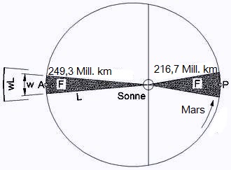 Der etwas genauere Wert für die Länge des Mars-Jahres ist: 669,6 Sol. Der Bahnwinkel während eines Sol beträgt demzufolge nur etwa 0,54° (pro Mars-Jahr eine ganze Bahnrunde =360°). Sein Mittelwert ist: Die überstrichene Fläche F (Abb.3) ist ein sehr spitzes Kreissegment. Es kann in Näherung (#3) als rechtwinkliges Dreieck mit w·L als kurzer Kathete aufgefasst werden. Die Fläche ist: