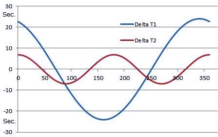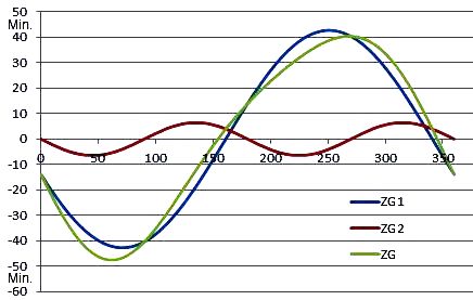 5. Vergleiche mit der Zeitgleichung auf der ErdeDie zum Vergleich verwendeten Zahlen-Werte für die Erde sind dem Artikel "Die Zeitgleichung, elementar behandelt" entnommen (das Gleiche gilt auch für den Abschnitt 4.4 vorher). 5.1 ZG1 (Ursache 1)