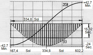 Abb.4 zeigt die Schwankungen der Sol-Länge 4. Vor- und Nachgehen der wahren Sonnenzeit auf dem Mars4.1 Ellipse (Ursache 1)In Abb.5 sind die Sol-Verkürzungen aus Ursache 1 zwischen 168. und 502. Sol des Mars-Jahres (in der mittleren Hälfte des Jahres) etwa jeden 9. Tag mit einem Balken gekennzeichnet. Denkt man sich in die Lücken die übrigen Sol-Balken gezeichnet, so ist zwischen der Kurve der Gleichung (1) und der Null-Linie eine gefüllte Fläche entstanden. Sie enthält die Summe aller Verkürzungen in diesem Zeitraum, die der Sonnenuhr von grösstem Nachgehen (-42,74Min.) zu grösstem Vorgehen (+42,74Min.) verhilft. Letzteres zeigt die in Abb.5 auch enthaltene Kurve ZG1 die wegen (#1) eine Sinus-Linie ist. Weil die Steigung hier (Perioden-Mitte) positiv ist, handelt es sich um den negativen Sinus.