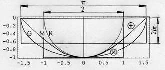 << Abb.6 geometrische Näherung einer Cosinus-Fläche Der Mittelwert aus der K- und der G-Fläche kann als die gesuchte Fläche angenommen werden: FM = (FK+FG)/2 = 2,02. Weiter wird mit dem runden Wert 2 gerechnet, der sich auch anbietet bei Näherung der gesuchten Fläche durch das Rechteck 2 mal 1. Die beiden Eck-Flächen Ä und Å scheinen gleich gross zu sein (Anmerkung 6). Das schmale Ersatz-Rechteck hat folglich die "Amplitude" 2/π. In der Fläche von Abb.5 ist die Amplitude nicht 1 sondern 24,07Sec., die beim Rechteck zu 15,32Sec. (24,07Sec.·(2/π)) wird. Die Fläche stellt also 15,32Sec.·334,8 = 5129Sec.. = 2·42,74Min. dar, wie oben angegeben. Die Amplitude (42,74Min.) und die Phasenlage (negativer Sinus) des elliptischen Teils der Zeitgleichung sind somit gefunden. Die Teilgleichung lautet: d ist die Zeit von 0 bis 670 Sol. 4.2 Ekliptik (Ursache 2)Zum Vor -und Nachgehen der Sonnenuhr infolge Ursache 2 kommt man mit Überlegungen, die analog zu obigen sind. Die Cosinus-Kurve (2) mit Amplitude 6,94Sec. und der Periode von 334.8 Sol führt zur negativen Sinus-Kurve, der zweiten Teilgleichung: d ist die Zeit von 0 bis 670 Sol. 4.3 ZeitgleichungDie Addition der beiden Teilgleichungen (1a) und (2a) ist die gesuchte Zeitgleichung. Sie lautet: d ist die Zeit von 0 bis 670 Sol.