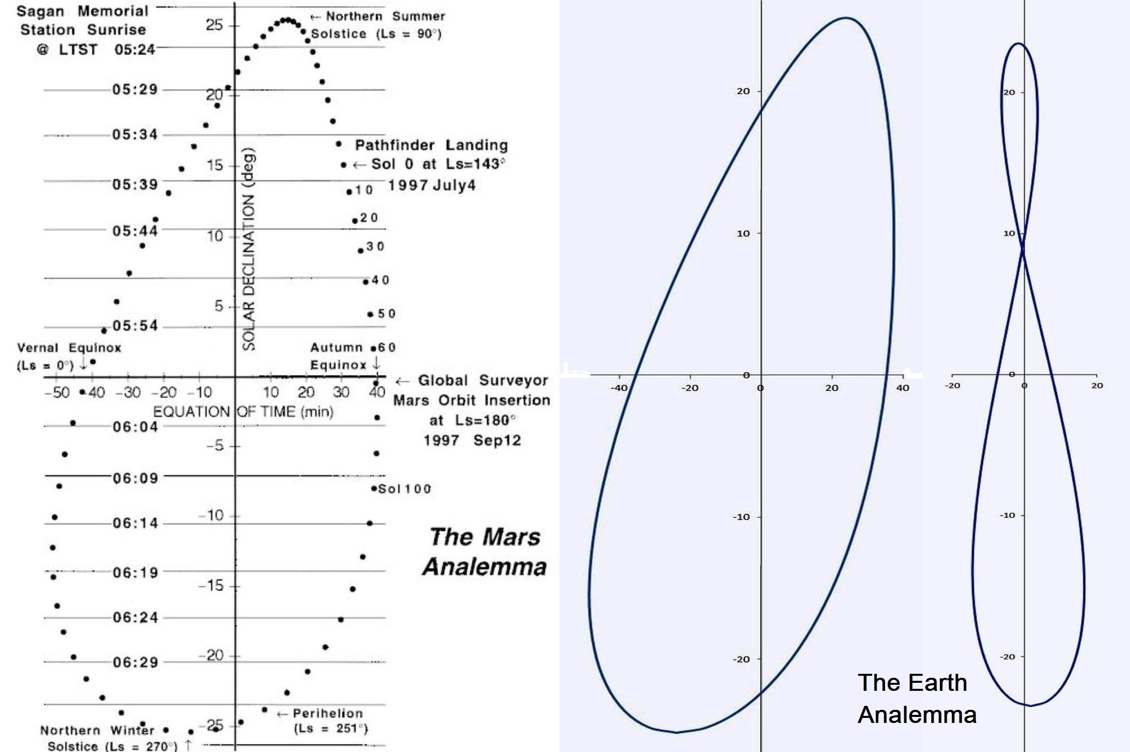 In der Abb.8 ist in der Mitte die im Vorherigen ermittelte Zeitgleichung als Analemma dargestellt. Zum Vergleich ist links ein von der NASA veröffentliches Bild, in dem lediglich das Analemma geringfügig breiter ist, beigefügt. Den Vergleich des Mars-Analemma mit dem der Erde ermöglicht das rechts befindliche Erde-Analemma: